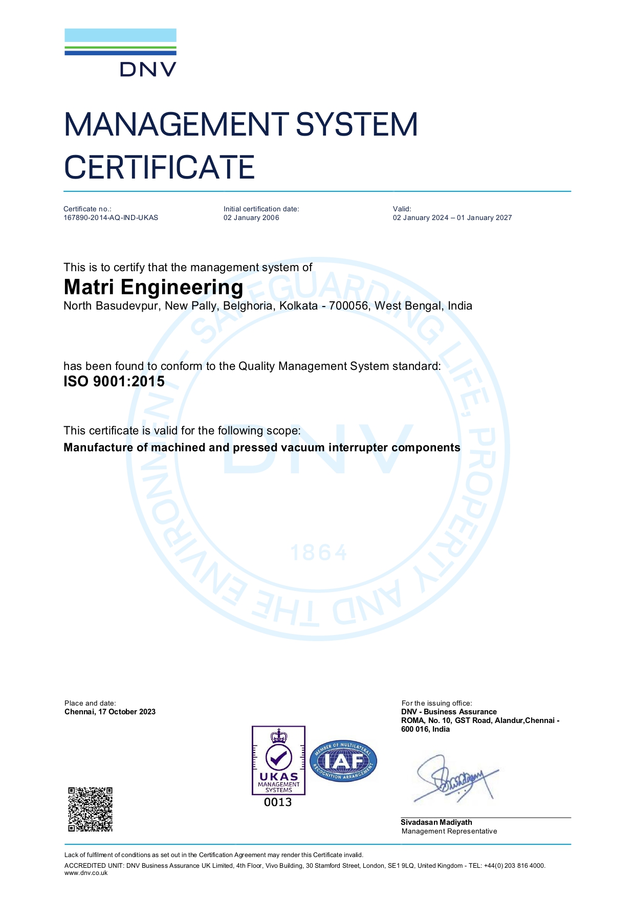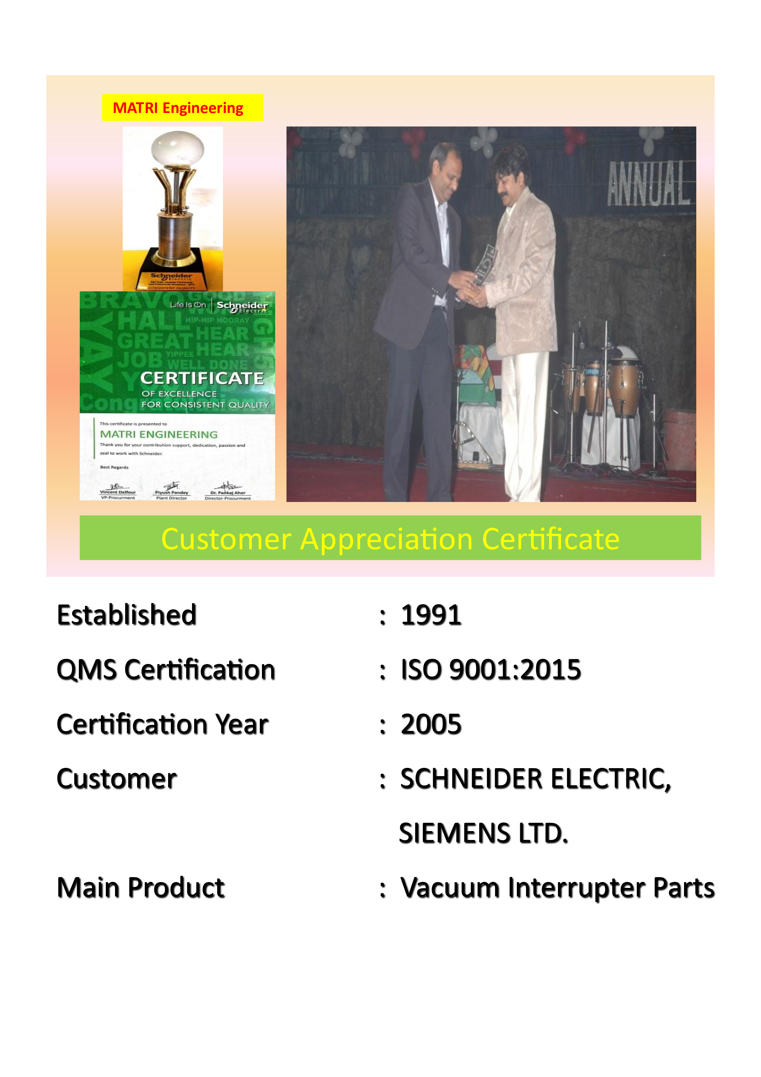 Matri Group, ISO 9001 2015, specializes in the production of Machined and Pressed Vacuum Interrupter Components and other high-voltage electrical products.